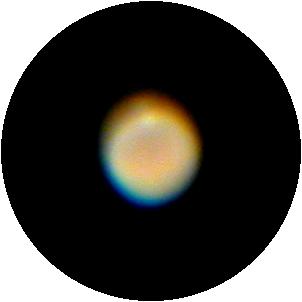 23. August 2003Am Abend des 23. August 2003 habe ich einen ersten Versuch mit dem gerade erworbenen Digitaladapter gestartet, aber nicht realisiert, daß im Gegensatz zum analogen Film die Digitalkamera möglichst dicht am Okular zu sitzen hat (halt dort, wo das Auge sitzt, das durch die Kamera ersetzt wird). Daher ist das Bild reichlich unscharf. 25. August 2003Zwei Tage und einige Tageslichtübungen später gelangen mir (jeweils bei maximaler Zoomeinstellung) trotz ziemlich schlechter Luftruhe ganz nette Aufnahmen - obwohl die Bewegungen der Luftschichten den Mars von seiner runden Gestalt etwas abbrachten. 16. September 2003Mit einem neu erworbenen 2"-Adapter ScopeTronix MaxView II von der Firma ScopeTronix habe ich den kleiner werdenden Mars noch einmal am 16. September 2003 aufgenommen. Die ISO-Einstellung war 100 für alle Aufnahmen. Ich habe auch mit dem hineinzoomen experimentiert. Als Fazit gefallen mir aber die digitalen Planetenaufnahmen mit einer über das Okular an das Teleskop geflanschten Digitalkamera nicht sehr gut.