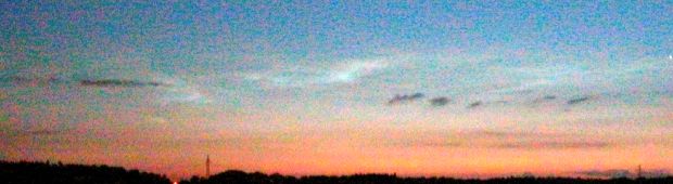 Ich hatte schon einige Male leuchtende Nachtwolken beobachtet, fand diese aber nie sehr imposant. Das war diesesmal anders! Diese leuchtenden Nachtwolken wurden auch in ganz Norddeustchland beobachtet und füllten in Hamburg fast den gesamten Nordhimmel. Ich mußte mich im südlicheren Uelzen mit einer weniger imposanten Erscheinung begnügen. Nichtsdestsotrotz hielt ich an und zückte meine mich oft begleitende Nikon Coolpix 5000. Mangels Stativ und Kabelauslöser mußte ich den Auslöser mit dem Finger fixieren und drückte dabei die Kamera manuell auf das Autodach fest. Die Bilder