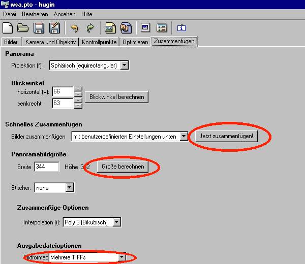 Zum Schluß muß man beim Reiter "Zusammenfügen" nach dem "Größe berechnen" die Bilder "mit benutzerdefinierten Einstellungen unten" zusammenfügen und "unten" dann "Mehrere TIFFs" auswählen: